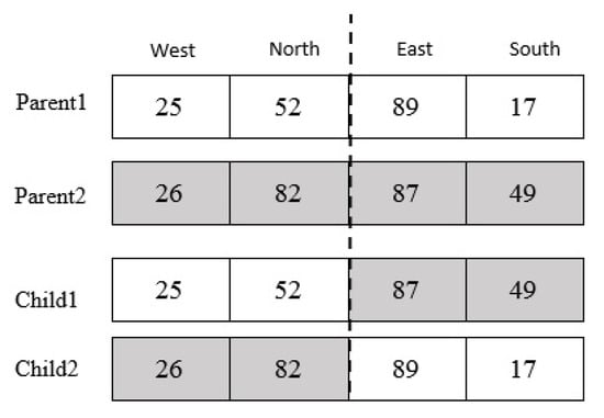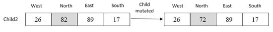 After the parental selection, the single-point crossover operator is applied with a probability of 0.8. A point on parent chromosomes is picked randomly, and the genes from that point of the chromosomes are moved []. In this case, new offspring is created, which inherits the first child of the first, and second genes from the first parent, and the third and fourth genes from the second parent, and also the second child inherits first and second genes from the second parent, and the third and fourth genes from the first parent. It should be considered the limitations must be applied to a new child as well. For example, considering two parent chromosomes in Figure 9, and applying crossover operator on them, a new child is produced as shown in Figure 11. The movement scope of the parents and child’s chromosomes are shown in Figure 12.