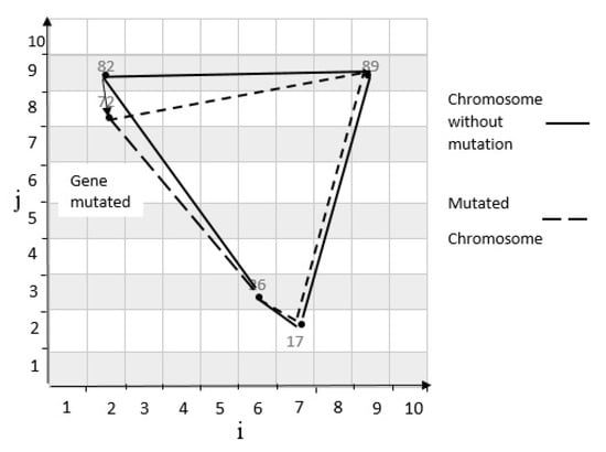 As mentioned in the previous subsections, a new child can be produced by using the crossover operator []. Now, if one of the genes of the child gets mutated, a new child will be produced. In this article, a random mutation method is from which a chromosome gene is randomly selected and replaced by a new amount. Also, the limitations mentioned above apply to new off-springs. For example, the mutation operator is applied (See Figure 13) to the second child as described in Figure 14. The mutation rate of the above problem is 0.1 and the mutation rate for the northern gene is 0.02. Therefore, the mutation rate of north gene is less than the mutation rate of the problem. Hence, the second child is mutated. The coordinates of the northern gene are changed to (2, 8) and the determinants are calculated as discussed next. The result of the determinism is positive, indicating that the new cell coordinates are properly selected, and they form a scope with other cells.