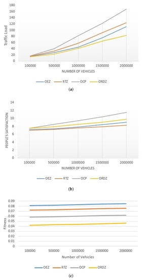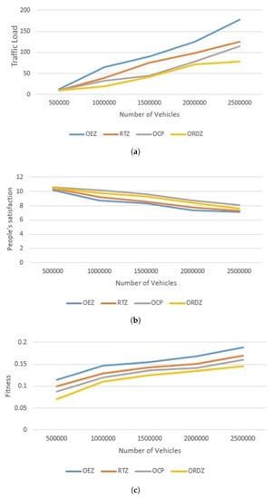 Figure 16a compares ORDZ with OCP, RTZ and OEZ in terms of traffic load. As shown, ORDZ performs up to 23.81%, 19.87% and 14.23% better than OCP, OEZ and RTZ in terms of smoothing traffic. Please note that all of the above methods have same performance when vehicle density is low. According to the traffic flow theory [], when the number of vehicles on the road is small then the traffic flow conditions are considered free. When the number of the vehicles per day is less than 100,000, all methods have same performance. On the other hand, when vehicle density reaches the maximum rate, the traffic flow change to unstable condition. This is because more than 100,000 vehicles per day are on the road with persistent stop and go driving patterns. We also find that the OCP and ORDZ have the most and least traffic load, respectively. In OCP, restricted traffic zone is determined by two factors which include travel cost and citizen satisfaction. In this method, the restricted traffic zone is determined based on the lowest travel cost and the highest satisfaction. However, in fact, the lowest tendency of people for using a toll zone show that in this method the advantage of reducing the traffic load is estimated much lower than considering the toll payment. On the other hand, the volume-to-capacity ratio of OEZ and RTZ are more than ORDZ. Therefore, it is expected that the traffic loads of these zones are more than ORDZ. It is clear that the performance of OCP, RTZ and OEZ methods in terms of traffic load are much lower than ORDZ.