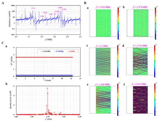 Numerical simulation of resonance frequency and acoustic pressure fields with respect to frequency. (A) Variations of admittance with respect to frequency for multilayer piezoelectric resonator. (B) Acoustic pressure fields at resonance frequency (f) ((a) f = 1.916 MHz, (b) f = 1.978 MHz, (c) f = 2.1 MHZ, (d) f = 2.154 MHz, (e) f = 2.188 MHz, and (g) f = 2.212 MHz). (C) Variations of averaged acoustic pressure (<P>) and quality factor with respect to excitation frequency values ranging from f = 2 MHz to f = 2.2 MHZ. (a) Variation of <P> with respect to L and f = 1.916, 1.978, and 2.1 MHz. (b) Variations of quality factor with respect to frequency.