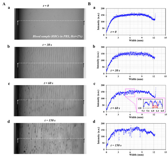 To visualize the behaviors of RBCs suspended in the ultrasonic transducer, the blood sample was diluted extremely to Hct = 2% by adding normal RBCs to 1x PBS. The acoustic power of the controller was kept constant at AP = 2 W. Snapshots were then captured sequentially at intervals of 0.5 s. Figure 3A shows a snapshots captured at a specific time ((a) t = 0, (b) t = 30 s, (c) t = 60 s, and (d) t = 150 s).
