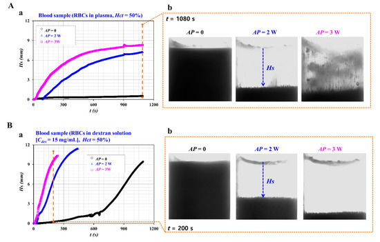 Contributions of acoustic power to RBC-to-liquid separation. (A) Variations of Hs for blood sample (Normal RBCs in plasma, Hct = 50%) with respect to the acoustic power (AP). (a) Temporal variations of Hs with respect to AP. (b) Snapshot captured at t = 1080 s with respect to AP r. (B) Variations of Hs for blood sample (Normal RBCs in dextran solution (Cdex = 15 mg/mL), Hct = 50%) with respect to AP. (a) Temporal variations of Hs with respect to AP. (b) Snapshot captured at t = 200 s with respect to AP.