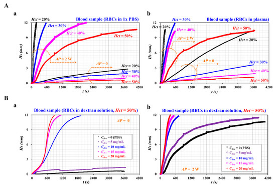 First, as hematocrit hindered the sedimentation rate of RBCs in the stationary flow condition, it was necessary to evaluate the effect of hematocrit on the RBC-to-liquid separation under acoustic power condition. A blood sample with Hct = 20%, 30%, 40%, and 50% was prepared by adding normal RBCs to diluent (i.e., 1x PBS, and plasma). To eliminate the effect of plasma protein on the sedimentation rate of RBCs, a blood sample was prepared by adding normal RBCs to 1x PBS. Figure 5A(a) shows temporal variations of Hs with respect to the acoustic power and hematocrit. Under no acoustic power, Hs changed slightly over time. Variations of Hs tended to decrease at higher values of hematocrit. In other words, a blood sample with Hct = 20% exhibited approximately Hs = 3 mm after an elapse of 3600 s. Furthermore, a blood sample with Hct = 50% exhibited an Hs value of approximately 1 mm after a duration of 3600 s. However, under an acoustic power of AP = 2 W, Hs achieved a saturation height (i.e., Hs = 12 mm) within a short time. The saturation time (TS) of the corresponding hematocrit was estimated to be TS = 200 s (Hct = 20%), TS = 600 s (Hct = 30%), and TS = 2100 s (Hct = 40%). For the blood sample with Hct = 50%, Hs tended to increase greatly. However, it did not achieve the saturation height after an elapse of 4100 s. The results indicated that the acoustic power was considered as effective for separating the RBCs from the blood sample. The value of Hs was therefore inversely proportional to the hematocrit level. According to a previous study [21], when RBCs were suspended into plasma rather than 1x PBS, the sedimentation rate of RBCs increased substantially. To verify the variation of the sedimentation rate, the blood sample was prepared by adding normal RBCs to the plasma. Figure 5A(b) shows temporal variations of Hs with respect to the acoustic power and hematocrit. When compared with the results shown in Figure 5A(a), plasma contributed to increasing Hs significantly. The saturation time tended to decrease significantly with respect to Hct = 20%, 30%, and 40%. Interestingly, the blood sample (Hct = 50%) did not show a significant difference depending on diluent. As the higher value of hematocrit hindered the sedimentation rate of RBCs significantly, plasma did not have a strong influence on variations of Hs when compared with 1x PBS. Based on the results, it was found that variations of Hs tended to decrease at a higher level of hematocrit. The acoustic power played a significant role in accelerating Hs over time. Under an acoustic power of 2 W, when compared with 1x PBS, plasma contributed to increasing variations of Hs, especially below Hct = 50%.
