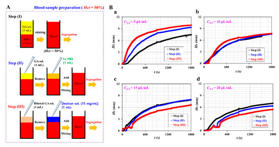 With respect to the three stages, the temporal variations of Hs for the blood sample were obtained by varying the concentration of the GA solution. Figure 6B(a) shows the temporal variations of Hs with respect to each step. Here, at step (I), the GA solution of 5 μL/mL was used to fix the membrane of normal RBCs. The result indicated that Hs tended to increase gradually by changing the diluent (i.e., GA solution → 1x PBS → dextran solution). Figure 6B(b) shows temporal variations of Hs for the hardened blood sample with CGA=10 μL/mL. Step (I) and step (II) did not show substantial differences with respect to the variation of Hs over time. Compared with step (I) and step (II), step (III) (i.e., dextran solution as diluent) exhibited a slight increase of Hs over time. However, as shown in Figure 6B(c,d), with respect to the higher concentration of GA solution (CGA = 15, and 20 μL/mL), step (III) shows a decrease of Hs over time. According to the experimental results, Hs tended to decrease gradually at higher concentrations of the GA solution. Below CGA = 10 μL/mL, the dextran solution [step (III)] contributed to an increasing Hs. However, above CGA = 15 μL/mL, the dextran solution contributed to a gradual decrease in Hs. At a higher concentration of GA solution, fixed RBCs did not contribute to RBC aggregation. In other words, the dextran solution did not contribute to the acceleration of Hs over time. During the procedure of blood sample preparation, dextran solution was added to dilute GA solution at step (III). The suctioning or discharging of the blood sample with a pipette required a large force. For the reason, it was inferred that the mixed solution between GA solution and dextran solution may hinder significantly the RBC-to-liquid separation.