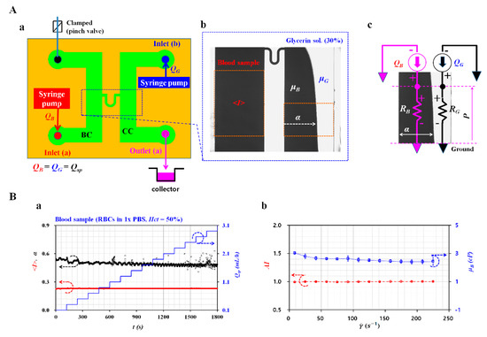 To measure RBC aggregation and blood viscosity under a microfluidic platform, a microfluidic device consisted of two channels (blood channel, and coflowing channel), and two inlets (a, b), one process inlet (a), and one outlet (b). As shown in Figure 7A(a), the blood channel (width = 2 mm, length = 22.5 mm) was connected to the coflowing channel (width = 2 mm, length = 22.5 mm) through a bridge channel (width = 100 μm, length = 1750 μm) [25]. The depth of this channel was fixed at 100 μm.