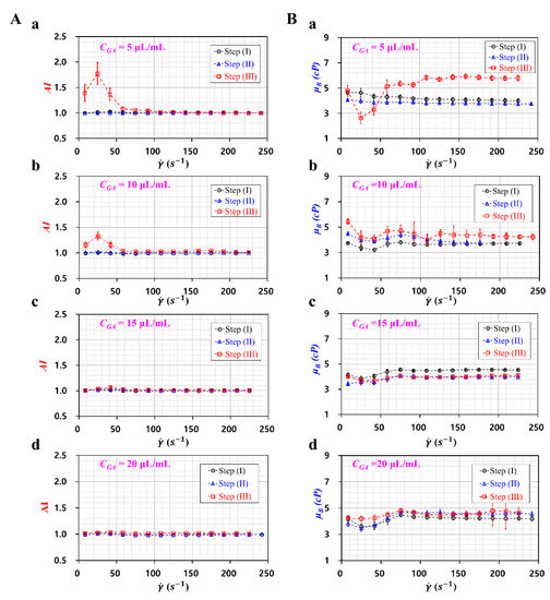 First, to evaluate the effects of RBCs or diluent on RBC aggregation, RBC aggregation were obtained by changing diluents (i.e., step (I), step (II), and step (III)) and GA solution (i.e., CGA = 5, 10, 15, and 20 μL/mL). As shown in Figure 8A, step (I) and step (II) did not exhibit variations of AI with respect to shear rate. However, step (III) shows that AI tended to decrease largely for up to CGA =10 μL/mL. Above CGA = 15 μL/mL, there was little variation of AI with respect to CGA. From this result, fixed RBCs with GA solution of CGA = 15~20 μL/mL did not contribute to the RBC aggregation.