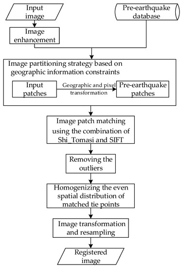 For earthquake disaster assessment using remote sensing (RS), multisource image registration is an important step. However, severe earthquakes will increase the deformation between the remote sensing images acquired before and after the earthquakes on different platforms. Traditional image registration methods can hardly meet the requirements of accuracy and efficiency of image registration of post-earthquake RS images used for disaster assessment. Therefore, an improved image registration method was proposed for the registration of multisource high-resolution remote sensing images. The proposed method used the combination of the Shi_Tomasi corner detection algorithm and scale-invariant feature transform (SIFT) to detect tie points from image patches obtained by an image partition strategy considering geographic information constraints. Then, the random sample consensus (RANSAC) and greedy algorithms were employed to remove outliers and redundant matched tie points. Additionally, a pre-earthquake RS image database was constructed using pre-earthquake high-resolution RS images and used as the references for image registration. The performance of the proposed method was evaluated using three image pairs covering regions affected by severe earthquakes. It was shown that the proposed method provided higher accuracy, less running time, and more tie points with a more even distribution than the classic SIFT method and the SIFT method using the same image partitioning strategy.