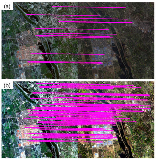 To test the advantage of the 2% linear stretch method, an experiment was performed using the GaoFen-1 (GF-1) multispectral image (with an 8-m resolution) and the SIFT algorithm. The original image yielded 16 matched tie points, as shown in Figure 2a. In contrast, the enhanced image obtained 119 matched tie points (Figure 2b). The experimental results show that applying the 2% linear stretching method on the images can facilitate the extraction of feature points and increase the number of matched tie points.
