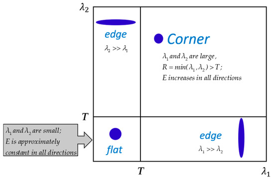 Different from the Harris algorithm, the score R for the Shi_Tomasi algorithm is calculated using Equation (8).