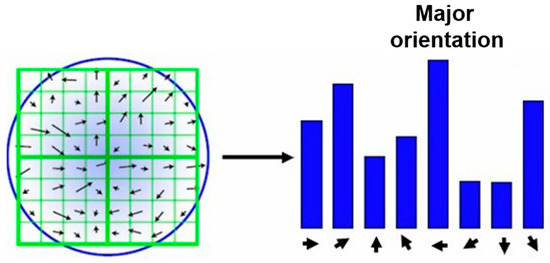 The SIFT descriptor was employed for feature description of the feature points detected in this work. The SIFT descriptor proposed by Lowe in 2004 is a local feature descriptor based on the gradient distribution in the detected regions. By assigning one or more consistent orientations to each feature point based on the gradient directions of a local image, the feature descriptor of the feature point can be represented relative to the orientations and therefore achieve invariance to image rotation. For each feature point (x, y) of the scale image L, the gradient magnitude m (x, y) and orientation θ (x, y) can be calculated using Equations (9) and (10), respectively.