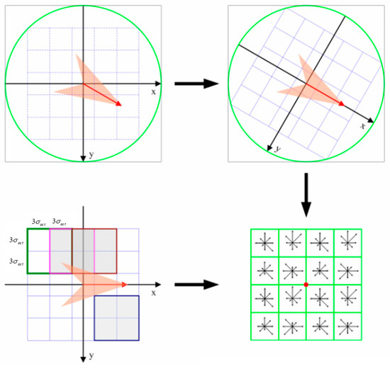 After determining the orientation of a feature point, the SIFT descriptor of the feature point is calculated using three steps, as illustrated in Figure 6.