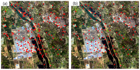Comparison of the spatial distribution of the initial matched tie points (a) and the remaining tie points after removing some tie points with high density (b).
