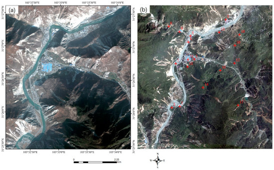 The Yaan earthquake dataset. The left (a) is the post-earthquake image (the input image), and the right (b) is the reference image in the pre-earthquake database. The points in red are the verification points used for calculating the accuracy of the rectified image.
