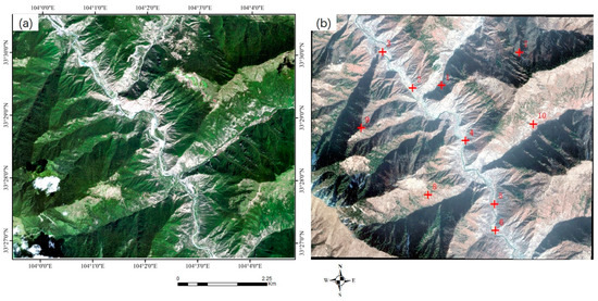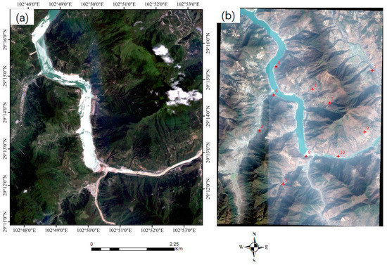 The Jiuzhaigou earthquake dataset. The left (a) is the post-earthquake image (the input image), and the right (b) is the reference image in the pre-earthquake database. The points in red are the verification points used for calculating the accuracy of the rectified image.