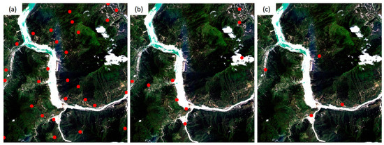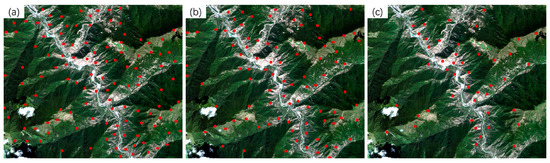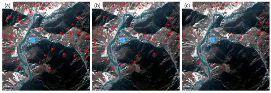 Matched tie points obtained from the Wenchuan dataset. (a) The proposed method; (b) Patch- scale-invariant feature transform (SIFT); and (c) SIFT.