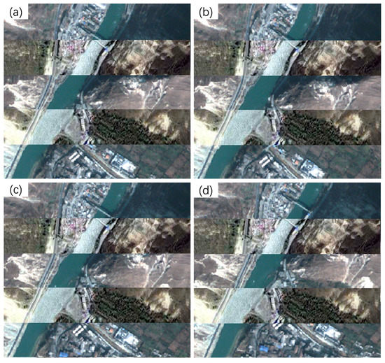 The details of the three post-disaster images and the corresponding reference images obtained from the pre-earthquake image database are presented in Table 2. The reference images are also shown on the right of Figure 8, Figure 9 and Figure 10.