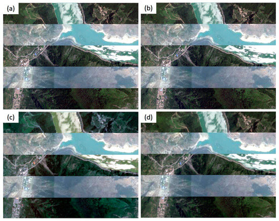 Registered images for the Jiuzhaigou dataset. (a) The original image; (b) the registered image of the proposed method; (c) the registered image of the Patch-SIFT method; and (d) the registered image of the SIFT method.