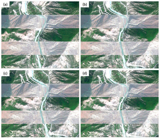 Registered images of the Wenchuan dataset. (a) The original image; (b) registered image using the proposed method; (c) registered image using Patch-SIFT; and (d) registered image using SIFT.