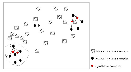 In spite of synthetic samples being obtained, some shortcomings of the traditional SMOTE may appear. Firstly, the new sample interpolated between sample points “a” and “b” interferes with the decision space of most types of speech samples, and even the new sample may coincide with the majority of samples. The sample point “b” is used as the neighbor of “c”, and the same problem occurs when the sample point “c” is interpolated. Then, the synthesized sample points can only be in the line between them when the sample points “a” and “e” are interpolated.