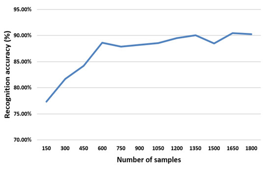 As seen in Figure 4, when the number of samples is less than 600, the recognition accuracy increases along with the increase of sample size. While the sample size exceeds 600, the recognition accuracy is close to 90% and tends to be stable.