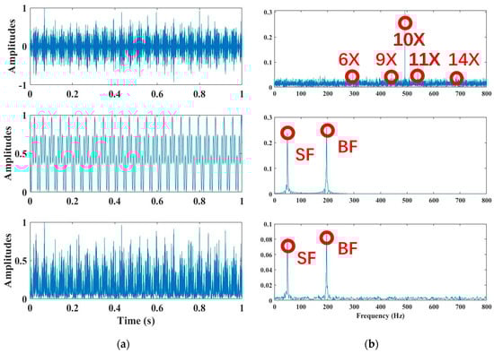 For the modeling of pump cavitation-caused signals, although it is time-varying, impulsive, and modulated by impeller rotation, the proposed CAM model is capable of reflecting the CSES characteristics of autocorrelation as follows: (1) CSES without cavitation: a family of comb components across the continuous spectrum, in which principal cyclic components (SF, BF, and their harmonics) sparsely distribute along low and middle frequencies, and a smooth carrier occupies high-frequency bands; (2) CSES with incipient cavitation: some high-order harmonics of SF and BF begin to be buried by cavitation-caused noise; (3) CSES with severe cavitation: noise clutters produced are so intensive that most of the harmonic components, even the BF, are buried. Additionally, there is no longer a family of comb components across the continuous spectrum. All these characteristics have been shown in Figure 1, Figure 3, and Figure 8, Figure 9, Figure 10, Figure 11, Figure 12 and Figure 13, and validated by real data of pump cavitation vibrations.