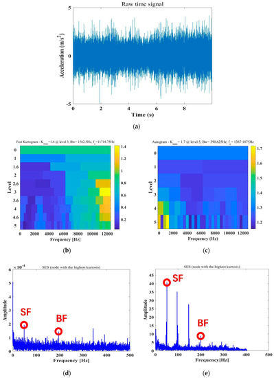 where is the signal collected at the time of , is the sampling index is the sampling frequency, is the average value of the signal, and is the total number of sampled data. As pointed out in [26,27,28], the Kurtogram performance is limited in several conditions, i.e., low SNR or strong non-Gaussian noise such as randomly distributed impulses.