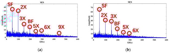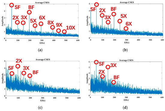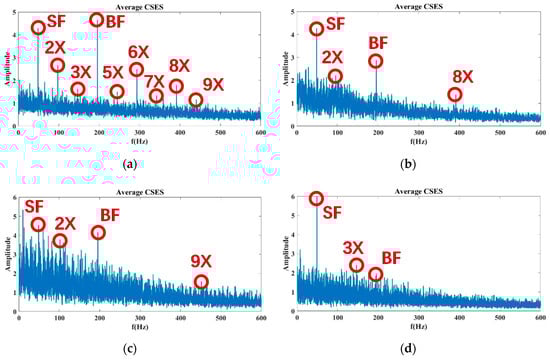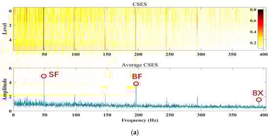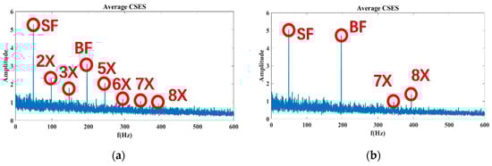 Therefore, the CNR parameter defined in Equation (10) can be calculated according to . Following the above routine, to calculate the CNR value in the SES of Figure 8, the cyclic frequencies are derived as SF and BF. For the CNR in the average CSES of Figure 11, the main frequency components selected are 1×, 2×, 3×, 5×, 6×, and 8× SF and BF. Therefore, the parameter CNRs for the SES spectrum and the CNRc for the average CSES are obtained as follows: