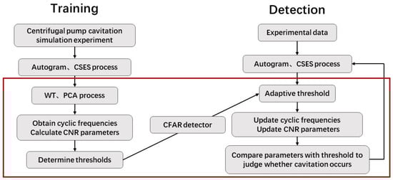As for the selection of the CNR threshold in judging cavitation, different sensor positions installed at one pump will also lead to different CNR thresholds. Before cavitation detection, it is necessary to carry out a series of experiments under a normal status, incipient cavitation, and severe cavitation. First, the actual CNR values are obtained from the SES or CSES spectrum by employing the Autogram method described in Section 3.1, and the CNR values are then matched with the normal status, incipient status, and cavitation status, respectively, by clustering analysis. Finally, the CNR thresholds are selected according to classified CNR values by maximizing the detection rate of cavitation. The above results are consistent with the incipient cavitation characteristics modeled by the proposed CAM model in Equation (1). The proposed CNR and CFAR threshold can be implemented by the flowchart in Figure 4.