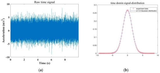 Pump vibration signals , and different distribution fittings for the signal , square-envelope (SE) X, and square-envelope spectrum (SES) X, respectively. (a) Measured vibrational acceleration signals from a centrifugal pump, noted as random signals ; (b) Gaussian distribution fitting for random signals , and , with and fitting error RMSE = 0.0013; (c) Gamma distribution fitting for square-envelope (SE) X, and X, with , and RMSE = 4.0892, where X is derived from Equation (5); (d) Rayleigh distribution fitting for the square-envelope spectrum (SES) X, and X, with and MSE = 0.0296, where X is derived from Equation (8).