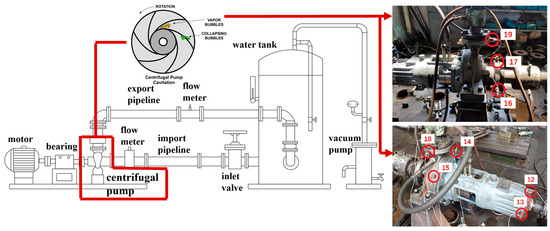 Configuration of a pump-valve test platform and the installation of eight accelerometers. In the middle part, the cavitation picture is taken from [37]. In the right part, the red circles (or ellipses) represent the accelerometers, and the number, such as 15, beside the circle is the accelerometer ID. The instruments from left to right are as follows: Motor, bearing, centrifugal pump, flowmeter, import pipeline, inlet valve, export pipeline, flowmeter, water tank, and vacuum pump.