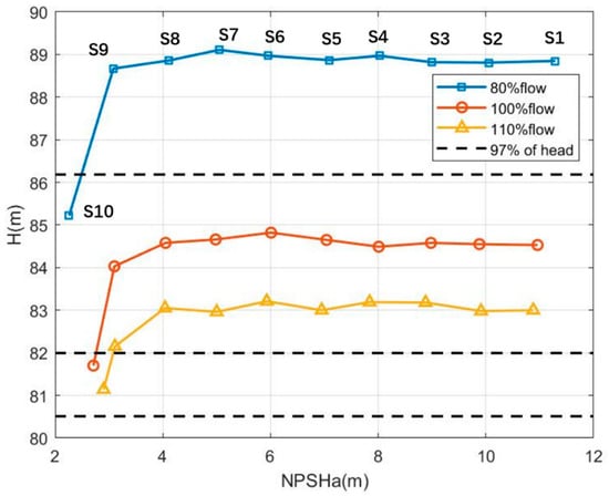Net Positive Suction Head (NPSH)a-Head curve of the centrifugal water pump HZE80-50-250 (Delu pump company, Hangzhou, China). H denotes the Head in the vertical label. The sample point of each state is an average result of ten groups of experimental data. Each group of data contains 10 s records, including about 256,000 samplings.