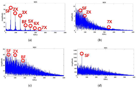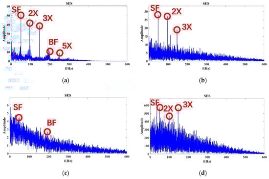 Results of the SES spectrum of the Autogram at a 110% flow rate at Sensor 15: (a) Status 1: No cavitation; (b) Status 8: Incipient cavitation; (c) Status 9: Severe cavitation; (d) Status 10: Very severe cavitation, which might cause an imbalance problem, since the shaft-rotating frequency (SF) is very much enforced.