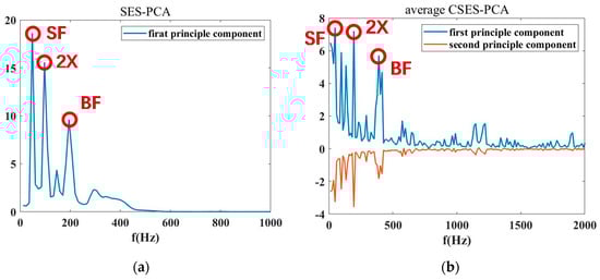 According to the advantages of the average CSES spectrum, the CNR parameter can be more precisely derived from the characteristics of the average CSES spectrum than the SES, as shown in Figure 8, Figure 9, Figure 10, Figure 11, Figure 12 and Figure 13. As discussed in Section 3.3, for the selection of cyclic frequency components, we can use wavelet transformation (WT) to obtain the wavelet coefficient matrix of square-envelopes (SE), in which the SE has the biggest Kurtosis value, as derived in Step 4 of Section 3.1, and then employ PCA to extract the principal wavelet coefficients. This means that the ensemble of the index of characteristic frequencies can be determined from the PCA and WT procedure. The above routine can be described as shown in Algorithm 1.