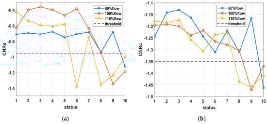 According to the classification of CNR values with the corresponding status, it is reasonable to make the CNRs threshold −1.00, i.e., when CNRs ≤ −1.00, its corresponding status is judged as cavitation. When the threshold of CNRc is −1.35, i.e., when CNRc ≤ −1.35, its corresponding status is judged as cavitation. Figure 14a shows that cavitation occurs at Status 10 at an 80% flow rate; at Status 9–10 at a 100% flow rate; and at Status 6, 8,9, and 10 at a 110% flow rate. In contrast, the detection result of Status 7 at a 110% flow rate is inconsistent with that of Figure 14b. As we pointed out, the CNR parameter was more precisely derived from the average CSES spectrum than the SES, so CNRc was more robust than CNRs. In Figure 14b, the CFAR threshold of parameter CNRc revealed that cavitation occurs at Status 10 at a 80% flow rate, Status 9–10 at a 100% flow rate; and Status 8, 9, and 10 at a 110% flow rate. There was no misjudgment at Status 7 at a 110% flow rate for the CNRc curve and its CFAR threshold.