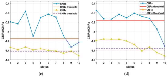 The results in Figure 15c,d show that the CFAR thresholds were adjusted adaptively to deal with new data from Sensor 17 and 19 at a 100% flow rate. According to Equation (15), the selected CFAR threshold of CNRs for the data at Sensor 15 in Figure 15a can be used to infer the new CFAR threshold at Sensor 17, as shown in Figure 15c. Similarly, the selected CFAR threshold of CNRc at Sensor 15 in Figure 15b can help to derive the new CFAR threshold at Sensor 19, as shown in Figure 15d. CNRc is more confidently able to judge that Status 8 exhibits incipient cavitation, and severe cavitation probably happens at Status 10. These conclusions are in good agreement with the detection results obtained using Sensor 15 data in the same condition, as Figure 14a,b shows.