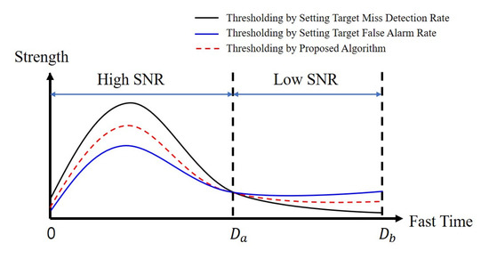 29] to propose a new thresholding method. The proposed algorithm compensates for issues that occur when the CFAR algorithm is used on indoor short-range radar owing to dense clutters. More specifically, the proposed algorithm considers both false alarm and miss-detection rates in determining a threshold by analyzing both the noise and target signals.