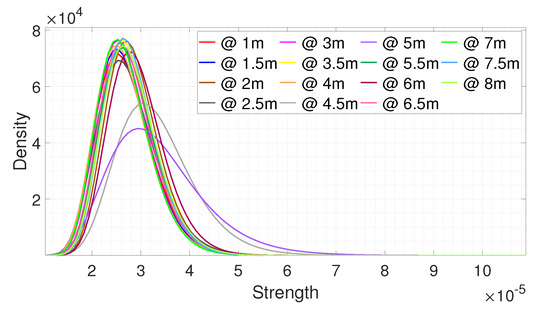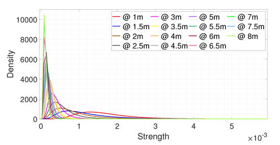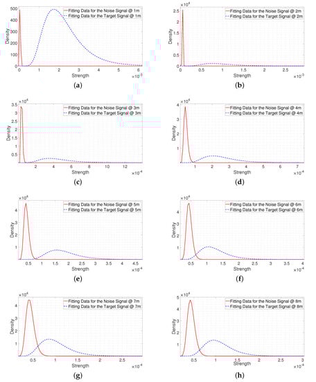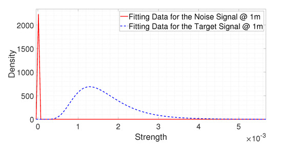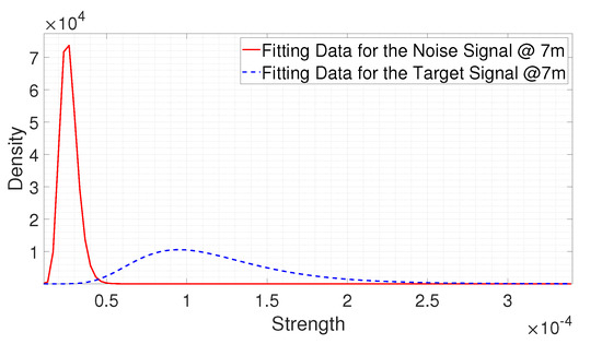 This means that a threshold can be designed to , as has satisfied the target miss-detection rate. We can see that there is a margin between and at the near-region, which means that a new threshold can be designed to further reduce false alarm and miss-detection rates when compared to target values. However, this cannot be done with alone, because we do not know how much the threshold can be adjusted without increasing the miss-detection rate compared with the target value. If we can know the margin between the strength of the signal reflected from a person and the strength of the noise signal, this work becomes possible, since the threshold can be adjusted between and .