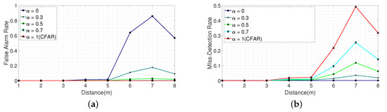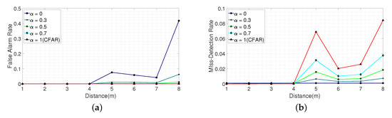 For the far-region, the signal is weaker than that of the near-region, and thus the threshold is smaller in the far-region. In addition, owing to the low SNR in the far-region, the probability that the noise signal is stronger than the signal reflected from the person is relatively high compared to the near-region. To maintain the target false alarm and miss-detection rates, could be higher than in the far-region. Thus, it becomes not possible to satisfy both the target false alarm and the target miss-detection rates as with the near-region. If is used as the final threshold, the false alarm rate can meet the target value, but the miss-detection rate would be higher than the target value. If is used as the final threshold, the miss-detection rate can meet the target value, but the false alarm rate would be higher than the target value. However, it is possible to adjust the threshold accordingly for the purpose.