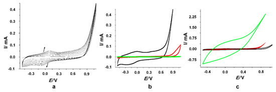 (a) Electrochemical deposition of 3-carboxylic polypyrrole in 0.1 M LiClO4 with 9 mg/mL PVP; (b) 10th cycle for the electrochemical polymerization of 3-carboxylic pyrrole in the presence of 9 mg/mL PVP in 0.1 M LiClO4 (black line), only in 0.1 M LiClO4 (red line) and in 0.1 M LiClO4 and 9 mg/mL PVP in the absence of the monomer (green line); (c) 10th cycle for the electrochemical polymerization of 3-carboxylic pyrrole 0.05 M (black line), 0.1 M (red line), and 0.25 M (green line) in the presence of PVP in 0.1 M LiClO4.