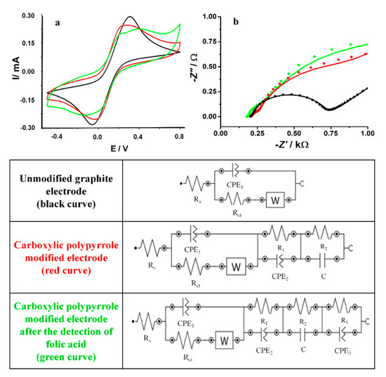 (a) Cyclic voltammetry (CV) and (b) electrochemical impedance spectroscopy (EIS) graphs performed in 5 mM [Fe(CN)6]3-/4- redox probe for the unmodified graphite-based screen printed electrode (black line), after the electrochemical generation of the polypyrrole structures (green line) and after the detection of 100 μM FA (red line). At the bottom of the figure: the equivalent circuits used for modeling the impedance experimental data.