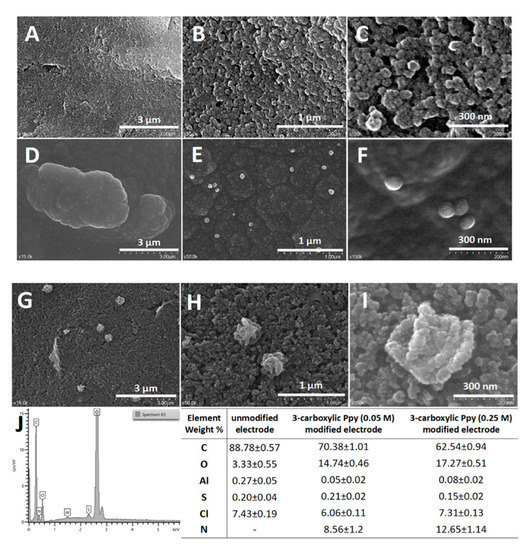SEM images performed on the carbon-based working surface at different magnifications (x15K, x50K, x150K): (A–C) unmodified graphite-based electrode; (D–F) 3-carboxylic pyrrole (0.05 M) in 0.1 M LiClO4 with 9 mg/mL PVP; (G–I) 3-carboxylic pyrrole (0.25 M) in 0.1 M LiClO4 with 9 mg/mL PVP; (J) EDX spectra; elemental composition of the electrode surface before and after the deposition of 3-carboxylic pyrrole (0.05 M and 0.25 M).