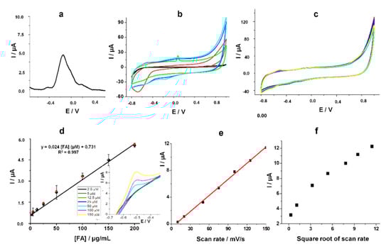 FA is a molecule that is strongly prone to the adsorption on the surface of the electrode due to the p-aminobenzoic acid moiety [25] and the high irregularity of the graphite-based working electrode. The current intensity corresponding to the anodic peak at −0.5 V increased proportionally with the scan rate confirming furthermore the adsorption of the analyte on the polymeric platform (Figure 4e). When plotting the current intensity against the square root of the scan rate, no linear correlation was observed, underlining that the electron transfer is not diffusion controlled, which means that FA molecules remain adsorbed on the electrode surface (Figure 4f).