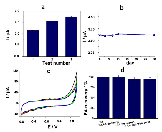(a) Current intensity (µA) of the anodic peak correlated with the electrochemical oxidation of 5,8-dihydrofolic acid after multiple tests on the same electrode in the presence of 100 μM FA; (b) Current intensity (µA) of the anodic peak correlated with the electrochemical oxidation of 5,8-dihydrofolic acid after 1, 3, 7, 10, and 30 days in the presence of 100 μM FA; (c) CV in 100 μM FA (black line) and 25 μM interfering agent in 20 mM PBS pH 7.4: dopamine (red line), serotonin (green line), and ascorbic acid (blue line); (d) Recoveries for the current intensity (µA) of the anodic peak correlated with the electrochemical oxidation of 5,8-dihydrofolic acid in the presence of 100 μM FA and of 25 μM interfering agents: dopamine, serotonin, and ascorbic acid.