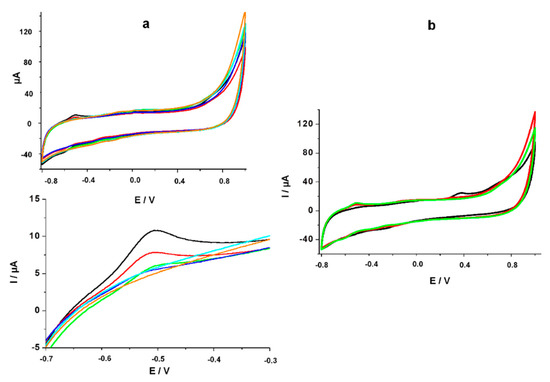 It can be seen that no anodic peak was observed at −0.5 V/Ag in the absence of the target analyte highlighting that the biological matrix does not interfere with the determination of FA (Figure 6a). The obtained results showed a very good recovery for the current intensity of the anodic peak: 101.9% (RSD 2.44%). Moreover, the current intensities of the anodic peaks were plotted in the calibration curve obtained with the FA standard solutions and the obtained results indicated an average recovery of the concentrations of 106.0% (RSD 16.7%). The obtained values were marked in red in the linear regression curve representation for the standard solutions of the analyte (see Figure 4d, red plots for 5 μM, 25 μM, 50 μM, 100 μM, 200 μM concentrations).