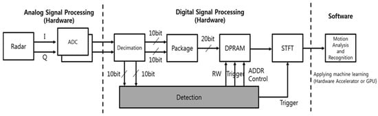 The digital signal processing part processes digital signals converted through the ADC. First, the digital signal which is transmitted by the analog signal processing part is preprocessed. Pre-Processing includes processing that proceeds to easily signal process the raw data coming in from the ADC. The pre-processing module consists of Decimation, Re-formation. The reason for proceeding with decimation is that using a sampling rate that is too high can increase the complexity and have processing times that are too high relative to the accuracy of the spectrogram. The decimated signal proceeds through the re-formation process. Re-formation is the process of converting the signal coming from the ADC to make it easier to perform bit operations. Pre-processed signals are connected on both sides by package and detection. The package is a module that combines I/Q data into one. The reason why I/Q data from the package is put together is to make it easy to save and access data measured at the same time of dual-ported random-access memory (DPRAM). The data generated from the package is transferred and stored to the space of DPRAM appointed by each ADDRESS. When a valid frame is detected, the detection module analyzes the received decimation signal to determine if a valid frame has been detected. Then the detection module informs the DPRAM and the STFT modules that the available frame has been detected via the trigger signal. The detection module also notifies the DPRAM of the ADDRESS where there is a valid frame of data stored in the DPRAM via the ADDRESS control signal. Finally, the detection module indicates whether to write that it is to read data from the DPRAM using the R/W signal. The DPRAM module saves and outputs decimation data based on the signal from the detection. The STFT module makes from a valid frame to the spectrogram. When the trigger signal comes in, the STFT module receives a valid frame from the DPRAM; this frame is output to spectrogram by STFT. The software part analyzes and recognizes motion using the spectrogram transmitted by the digital signal processing part. The software part performs machine learning using a hardware accelerator or a graphics processing unit (GPU) on the spectrogram. It makes possible to recognize any motion according to the spectrogram using a machine learning model generated through machine learning.