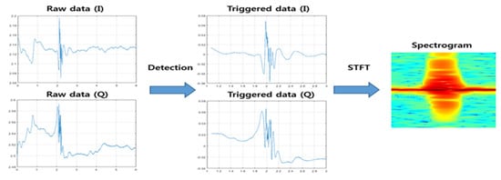 In this section, the conventional method [] and the proposed method are presented. The conventional method calculates a trigger value from the raw data. Then, a trigger value is compared with the threshold. The proposed method consists of a 2-stage detection method. The first stage of the proposed method roughly detects the valid data. After that, the second stage proceeds with detection where it has the largest energy near the detection position of the first stage. Figure 2 shows a spectrogram created on the valid frame data detected in raw data.
