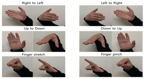 Figure 5 shows the hand gestures. The six hand gestures consist of right-to-left, left-to-right, up-to-down, down-to-up, finger stretch and finger pinch. The distance to the hand was set to about 30 cm in the radar module. Also, we measured the micro-Doppler signal of the hand gesture in front of the radar module. The gestures of right-to-left and left-to-right consisted of 45 degrees of movement from the radar line of sight. The gestures of Up to down and Down to up had 45 degrees of movement from the horizontal position of the radar. The maximum angle of outstretched fingers was 90 degrees for finger gestures. Four people took part in the experiments. Before measuring the raw data, each hand gesture was ready to the initial pose as shown in the left part of Figure 5. Each hand gesture was performed with undetermined time delay after the start of data gathering system. One person did repeatedly an action 100 times for each gesture, which resulted in the collection of 400 data for each gesture. The raw data were measured for 6 s, in which the hand gesture frames were included for 1.8 s with unknown time position. The starting point (valid frame) of hand gesture should be correctly determined by the detection algorithm before the start of recognition process.