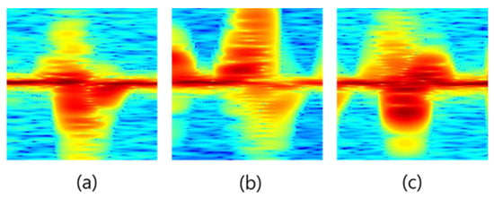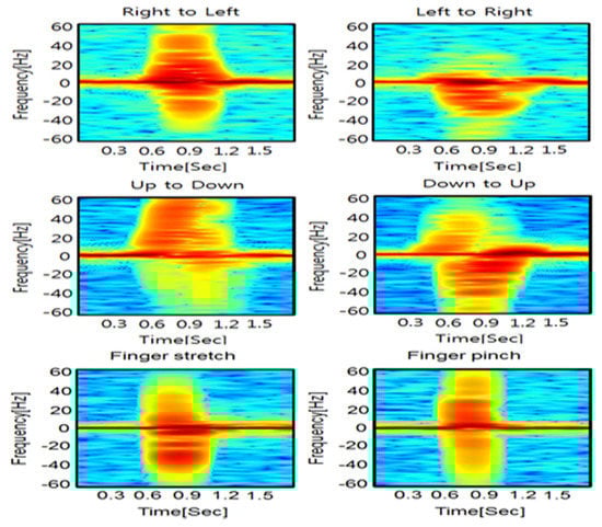 Spectrograms of multiple hand gestures: (a) spectrogram of the first hand gesture (right-to-left); (b) spectrogram of the second hand gesture (up-to-down); (c) spectrogram of the third hand gesture (finger stretch).