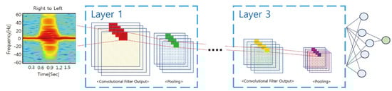 As shown at Figure 7, the convolutional neural network (CNN) model was constructed using a spectrogram created using the ideal method. We utilized the data for training with 90% of the obtained micro-Doppler signals. And the rest of the measured data were used for both the inference and the accuracy estimation. The CNN consisted of three convolutional layers, each of which contained the combination of convolution filters, an activation function and a pooling. Through experiment optimization, 16 convolution filters and an average-pooling scheme were used. An activation function was a sigmoid function.