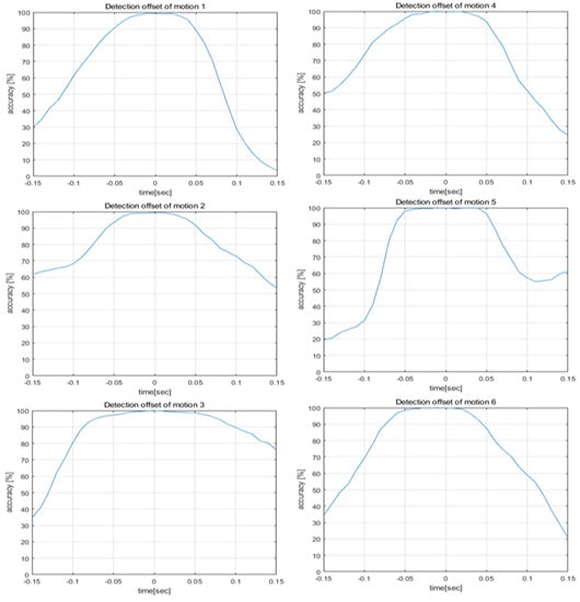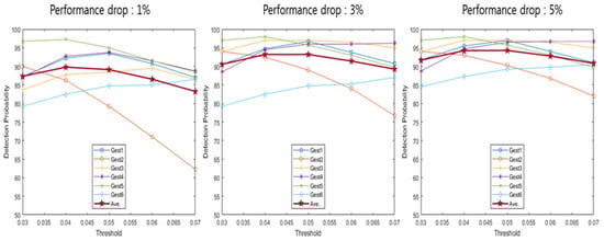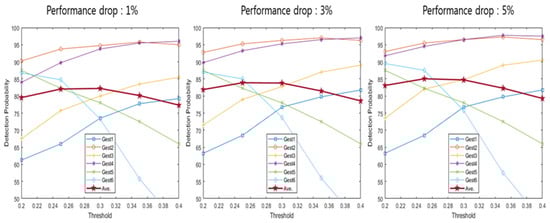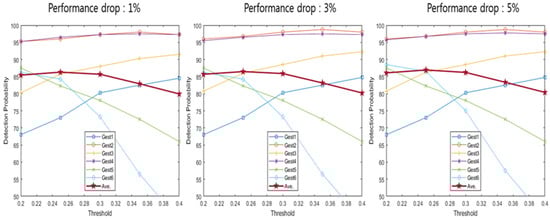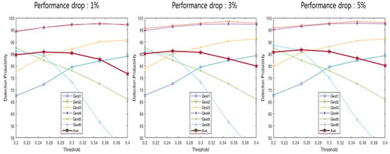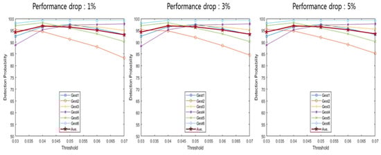 Table 1 indicates a detection range based on the performance drop according to the detection offset. The detection range was calculated for each detection offset where the performance drops were 1%, 3% and 5%. Detection probability uses the detection range described in Table 1 to calculate the probability that the spectrogram configured using each method enters the detection range. Figure 9, Figure 10, Figure 11, Figure 12 and Figure 13 depict the detection probability of each method. Each graph was created according to the detection range for each offset. A window does not exist in the conventional method, but the proposed method consists of a 2-stage and a window exists. The size of window 1 was 0.1 s; the size of window 2 was 0.2 s. The window of the proposed method 1 consists of a frame after the frame detected in the first stage and proposed method 2 consists of a frame before and a frame after the frame detected in the first stage. Looking at Figure 9′s conventional method detection probability, it can be seen that the detection probability changes significantly based on each threshold. The gestures 1–4 were large movements that use the whole hand, so it was possible to see a high detection probability when the threshold was high, but a low detection probability when the threshold was low. However, since the gestures 5–6 were small movements using only two fingers, it can be seen that the detection probability was low when the threshold was large, and detection probability was high when the threshold was small. Large gestures cause the trigger value to fluctuate more than small gestures. Therefore, there was a probability that early detection occurs when the threshold was small for large gestures. Early detection means an error detecting a frame exists before a valid frame. Conversely, small gestures were indicated by small changes in the trigger value. Thus, small gestures have a probability that a miss will occur if the threshold was large. A miss means passing without detecting a valid frame. As each performance drop increases, the detection range expands more. Therefore, when the performance drop was high, it can be seen that the detection probability becomes the same as or higher than when the performance drop was low. The conventional method has the advantage of being the simplest over the other methods However, the conventional method has the disadvantage of a low detection probability. Looking at Figure 9, Figure 10 and Figure 11 and Table 2, Table 3 and Table 4, the proposed method 1 shows a higher detection probability than the conventional method, because the first stage was added in the conventional method. Also, when the window size was 0.2, the detection probability was higher than when the window size was 0.1. The reason why the detection probability was high when the window size was large was it has found the maximum value of the trigger value in a wider range. However, if the window size was large, it may need more time with the real-time process, so the difference in the size of the window size has advantages and disadvantages. The detection and recognition probabilities of the proposed method 1 increase up to 86–92% and up to 86−67%, respectively. The proposed method 1 shows a higher performance than the conventional method. However, since Stage 1 of the proposed method 1 uses the conventional method, the detection probability and the recognition probability change greatly according to the magnitude of the threshold. As described in the previous conventional method, a large gesture indicates a higher detection probability if the threshold was large; a small gesture indicates a higher detection probability if the threshold was small in the proposed method 1. Therefore, the proposed method 1 has problems such as the conventional method. After all, the proposed method 1 shows a higher performance than the conventional method, but it shows a performance that was not sufficient to configure the recognition system.